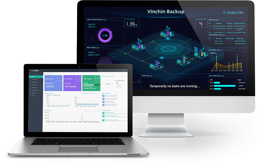 L’architecture B/S vous permet d’accéder à la console Web de n’importe où et à tout moment. Toutes les tâches de sauvegarde, de restauration, de copie et d’archivage sont configurées et effectuées dans ce seul panneau de verre, la gestion peut être aussi simple que prévu. Le tableau de bord et la visualisation des données de conception moderne permettent de surveiller tous les états liés à la sauvegarde et à la restauration des machines virtuelles, par exemple la protection et l’utilisation du stockage des machines virtuelles, l’état d’exécution des tâches actuelles / historiques, l’utilisation du processeur et de la mémoire du serveur / nœud de sauvegarde ainsi que l’état du flux réseau.